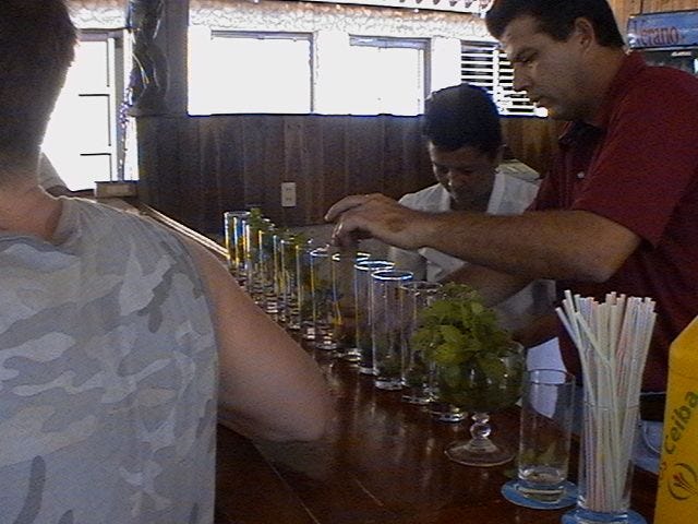 Kapitola sama pro sebe jsou pak bary presneji receno ty "Hammingwayovy oblibene". Podle jejich poctu by Ernst mohl na Nobelovku uspesne zapomenout pri pobihani z mista na misto v neustalem mojitovem opojeni. Pred objednavkou je vzdycky dobre se zeptat na specialni drink podniku a ten si dat. Ceny jsou od 2.5 do 6 pesos a kvalita vyjimecna. Cerstve ovoce a dlouholeta tradice dela pak z navstevy baru dokonaly zazitek pro chutove poharky. Dalsim postrehem je to, ze tak jak u nas je na stole solnicka, na Kube je to flaska kubanskeho rumu. Tak si muze kazdy svuj drink dochutit podle libosti. :)